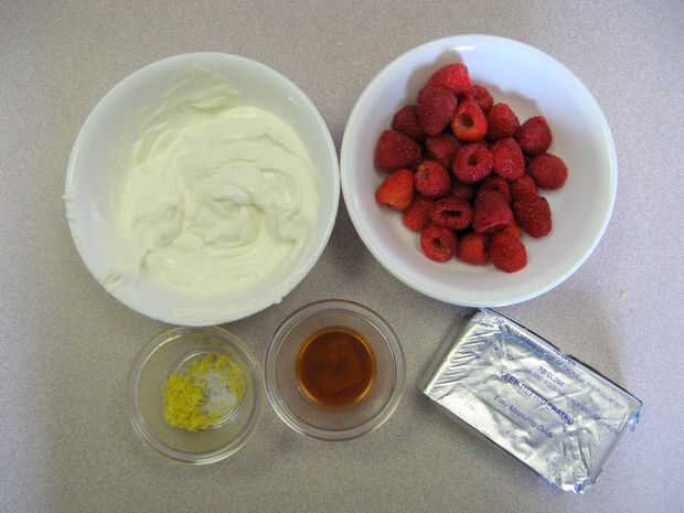 1 pinta frambuesas, enjuagar y secar. Reserva de 10-15 bayas para topping