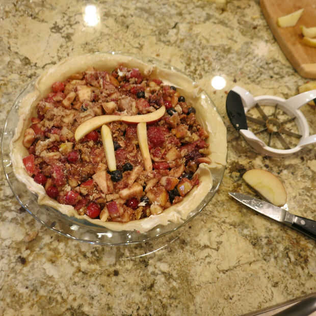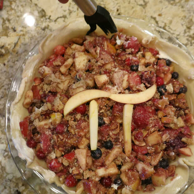 Es fácil de hacer un símbolo π . Corte una rebanada fina de una manzana con un cuchillo de cocina pequeño para obtener las formas correctas y presione suavemente la forma de pi sobre la mezcla de frutas/tuerca/especias.