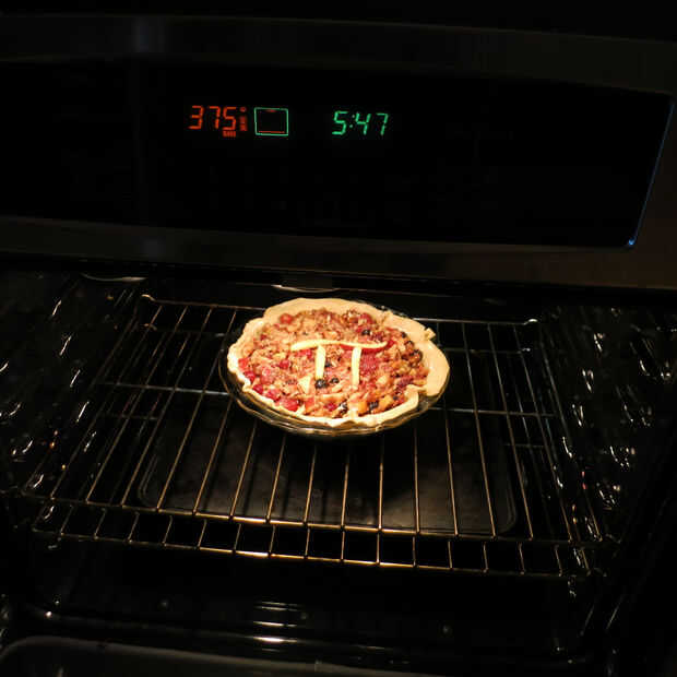 Hornear a 375 grados f el. durante 40-45 minutos, 5-10 minutos más si para hornear en un plato de cristal. Cubierto el borde de la base de tarta con mantequilla para que la corteza una textura extra escamosa, pero esto es opcional. Puesto que la fruta a menudo burbujas sobre el borde del plato como hornea, es una buena idea poner una bandeja para hornear debajo de la empanada para atrapar las gotas azucaradas.