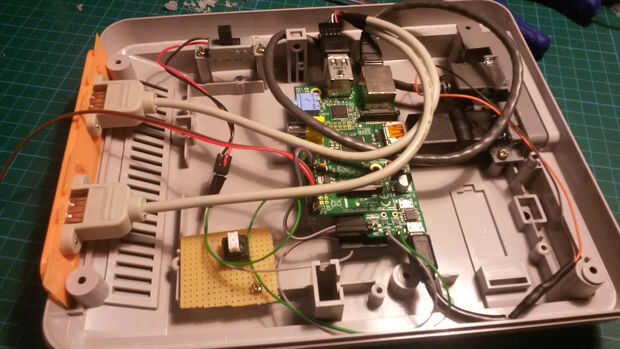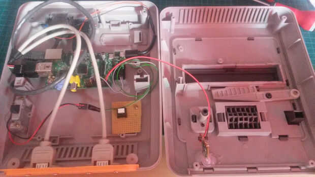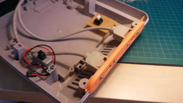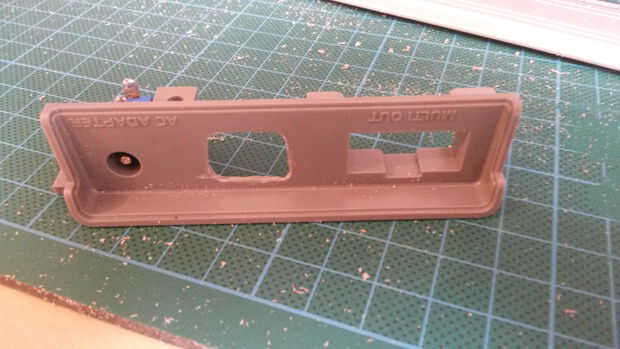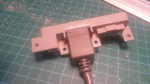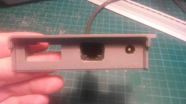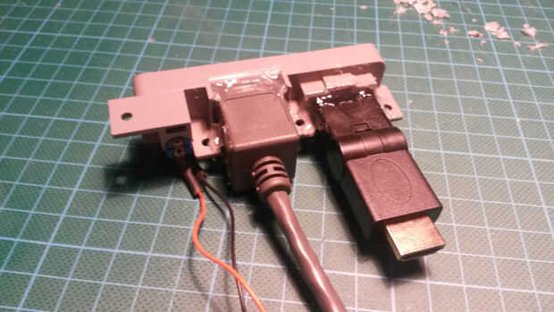 Corté un agujero para el conector de Ethernet, el cable HDMI se ajusta bien en el viejo conector de imagen. Guardé al enchufe y conectar un micro conector USB en el otro lado. "Caliente pegué" todo en su lugar.