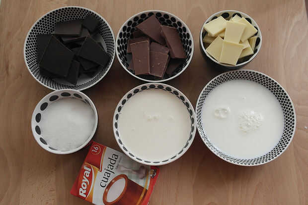 • Para el relleno de chocolate negro: 150 g de pasta de chocolate negro crema 200 ml de 35% de grasa, 200 ml de leche, 1 sobre de cuajada.