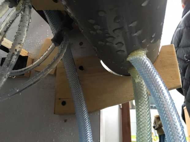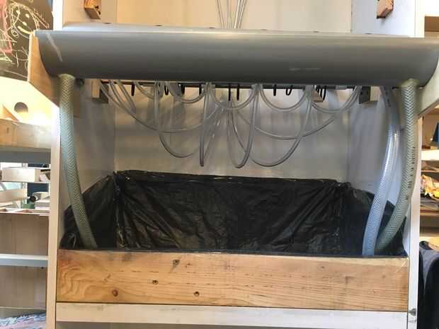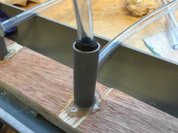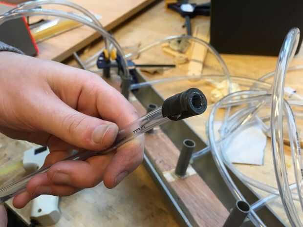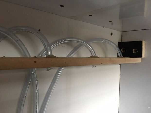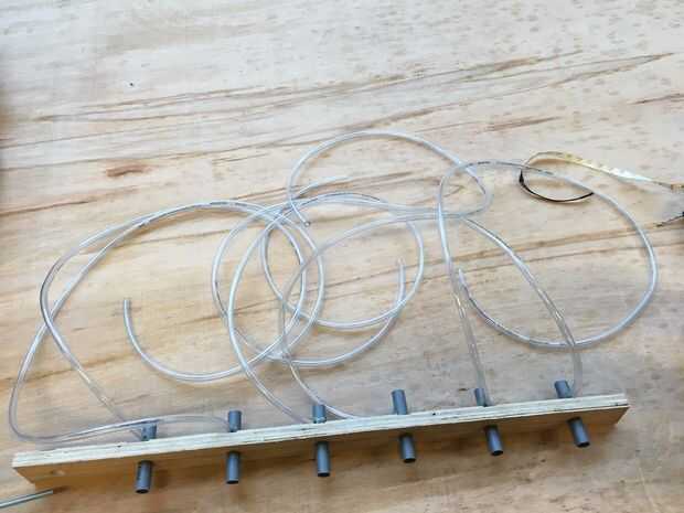 En este punto tienes la manguera de jardín conectada a los 6 tubos (a través de la tabla de apoyo) en el panel de instrumentos, y esos 6 tubos deben aprovechar a ver más delgada, de largo a través de tubo en el lado. Monte la tabla con el panel de instrumentos en el marco de la (armario). Acabado de los agujeros del panel de instrumentos: Asegúrese de que no sobresalga y sellar el espacio entre el tubo y el panel de instrumentos por lo que ningún agua puede correr lejos en la parte posterior. La primera dirección de la corriente del agua debe ser recta en el panel de instrumentos. Cuando bloquea ese hueco con su dedo de mano, el agua entrará en el tubo más pequeño en el lado.