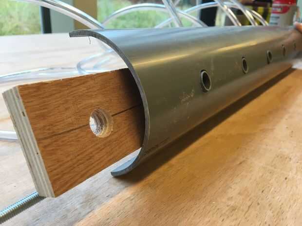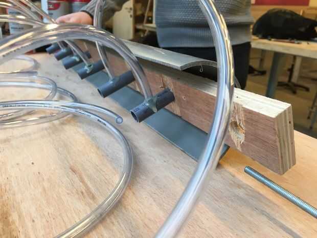 Para terminar el cableado, perfore orificios de 6 con el diámetro de los tubos pequeños en una tabla de 1m. Esto será el soporte de tubos superior. Difundir estos agujeros según el espacio necesario para cada instrumento. El agua que sale aquí caerá directamente sobre el martillo que puede golpear el instrumento. Poner los tubos en el soporte y fíjelo al marco. Elegimos el agua al caer sobre los martillos en lugar de rociar desde el lado debido a la ubicación de la viga del agua no es sensible de esta manera a la presión.