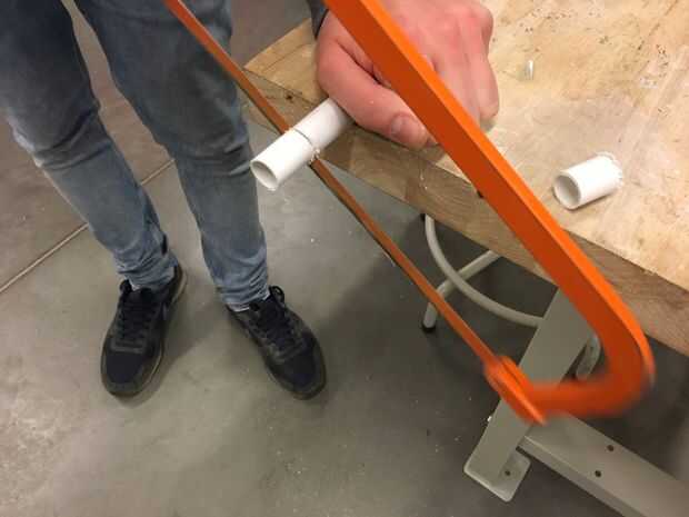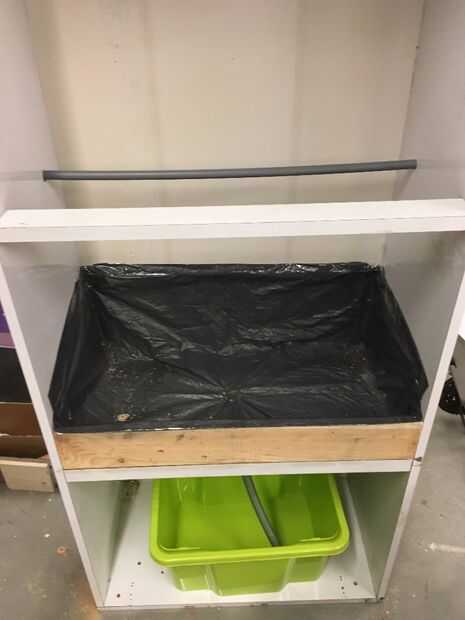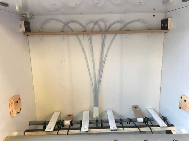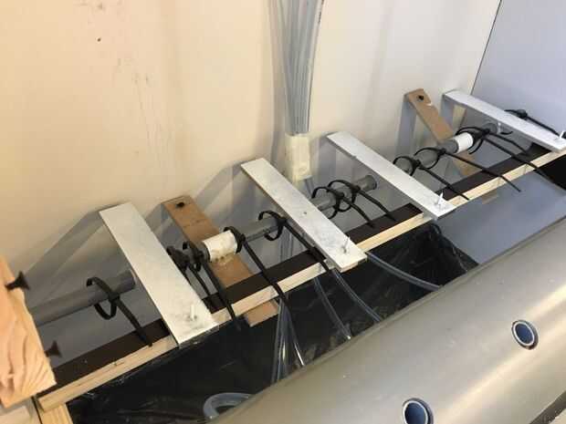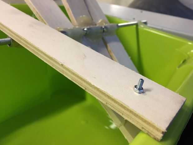 Inserte el eje en el bastidor (hemos perforado los agujeros en el lado del armario) y empujar sobre los martillos. En este punto poner la caja de plástico que sirve como el depósito de la bomba en la parte inferior y fije la bomba a la manguera de jardín. Se necesita que el agua que fluye para calibrar el lugar de los martillos. Asegurar que cada martillo es directamente en la viga del agua. Como podría utilizar la instalación exterior en condiciones de viento, es importante que este derecho bastante para que incluso con poco de viento el agua todavía puede golpear el martillo derecho. Para fijar la posición del martillo nos apretó dos bridas a ambos lados de cada tubo de martillo, por lo que no se puedan mover en el eje más.