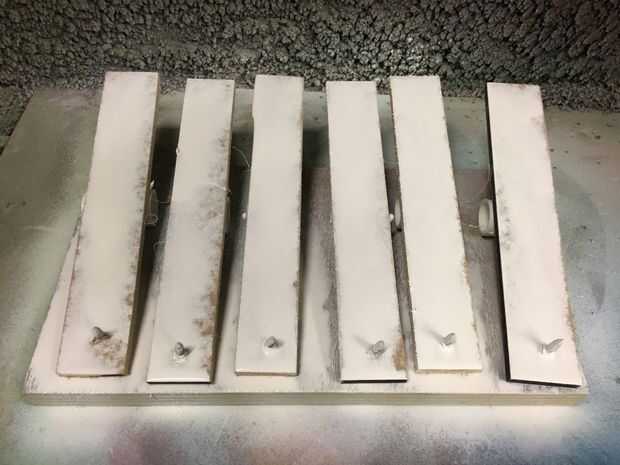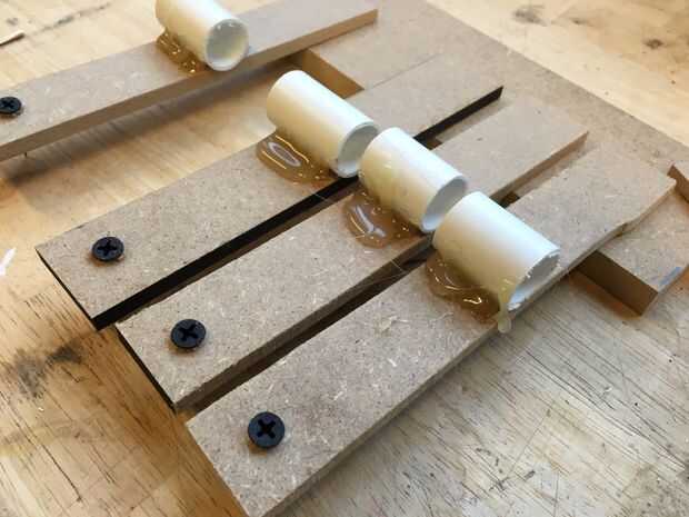 Ahora que todos los tubos estén en su lugar, puede hacer que los martillos. Hemos utilizado las sobras MDF, pero claramente hay mejores opciones al jugar con agua. Una cuchara de metal debería funcionar igual de bien y te ahorra algunos tuning extra.