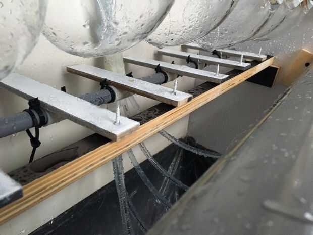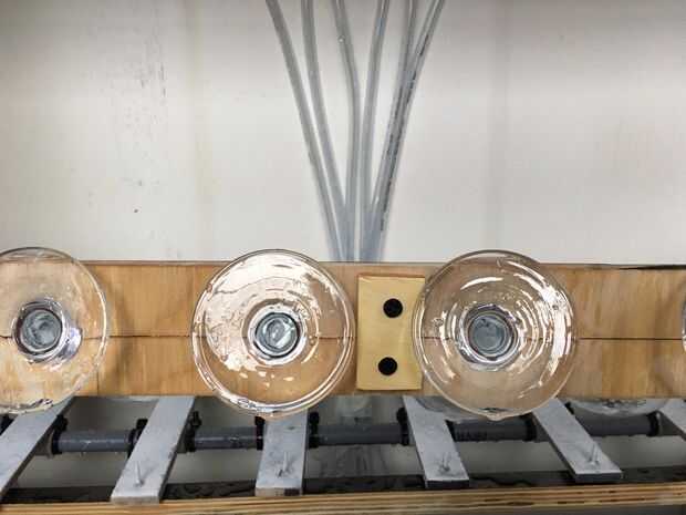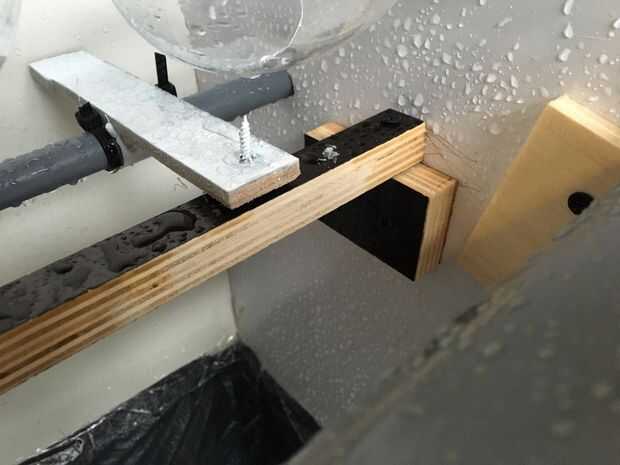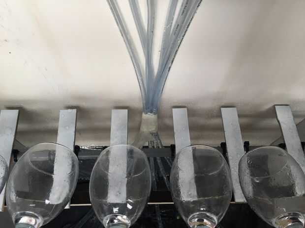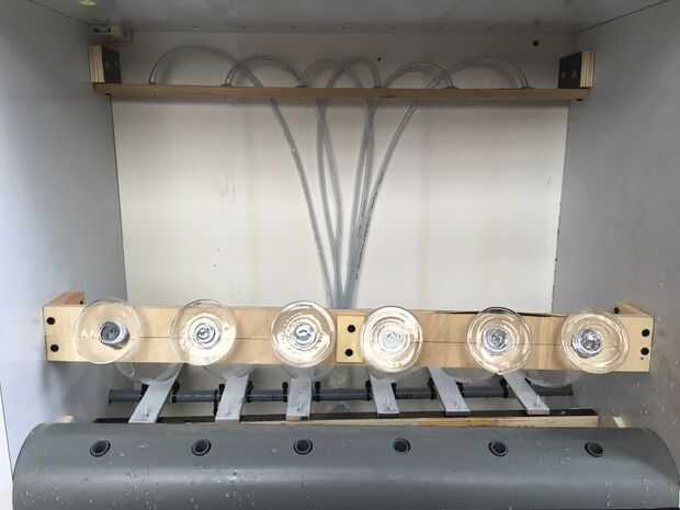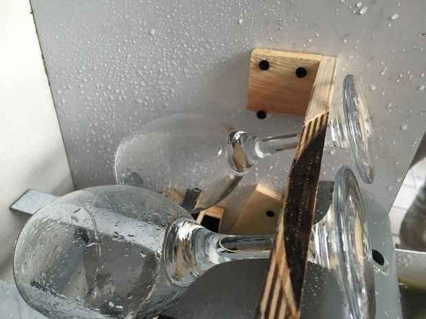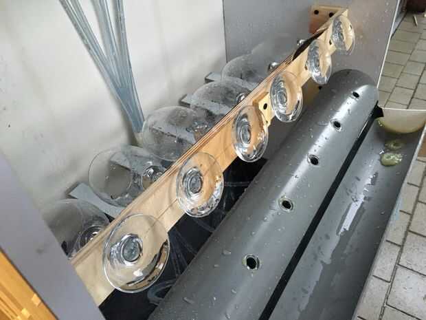 La parte de cierre es la instalación de los instrumentos. Utilizamos vidrios de vino simple. Podría tiene vasos de diversos tamaños y materiales o instrumentos reales u objetos para obtener sonidos diferentes (ej. tambores suena trabajo verdadera así) y tonos. Perforar la última plancha de 1m para poner en los vasos en las posiciones según los martillos. Sierra el tablón en 2 a lo largo de la longitud por lo que usted realmente puede poner en las gafas. Conectar las dos mitades y Monte el tablón al marco solo un poco por encima de los martillos. Prueba de la distancia correcta obtener el sonido deseado.