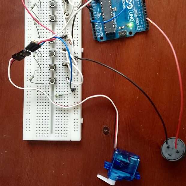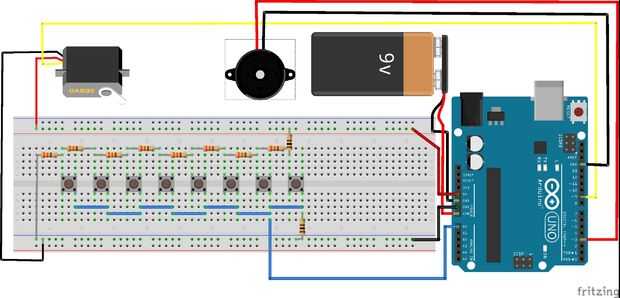 Sólo tiene que conectar los botones, resistencias, servo y piezo como se muestra en la imagen.