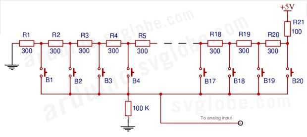 Para obtener un montón de botones en un único puerto (analógico), utilicé este método inteligente que encontré en internet. (gracias SVGLOBE.COM)