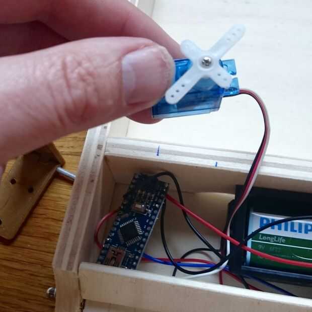 Poner el canal de cable el agujero en la capa y mantenerlo en la posición donde debe estar cuando se cierra el cuadro. (Asegúrese de que el servo también está en la posición cerrada)