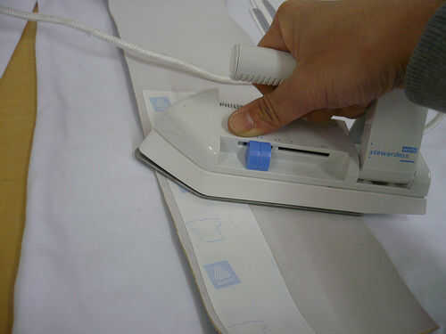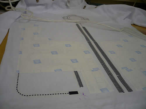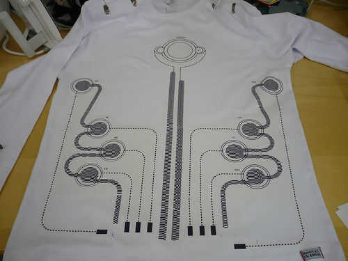 imprimir el patrón de circuito en la camiseta utilizando la plancha de chorro de tinta sobre papel. Hice un patrón de circuito con illustrator e impreso en plancha sobre el papel. Luego las piezas son corte y coloca sobre la camiseta y planchar en.