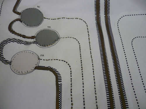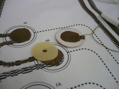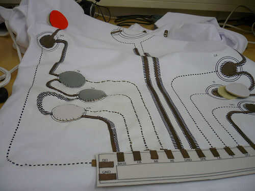cortar la espuma de 3mm para el tamaño del botón, haga un agujero en el medio y cerrar con el otro lado de la tecla. No te olvides de poner a la tela conductora de este lado del botón así. La conexión desde el botón se hace con hilo conductor. Se cose a la parte inferior de la camiseta