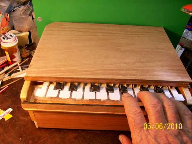 Hacer un pequeño Piano real luz a tus lap.and jugó como un piano de verdad. También puede funcionar como un aparato para las personas que deben ejercer los dedos artríticos. Va a jugar 2 octavas con sostenidos y bemoles.