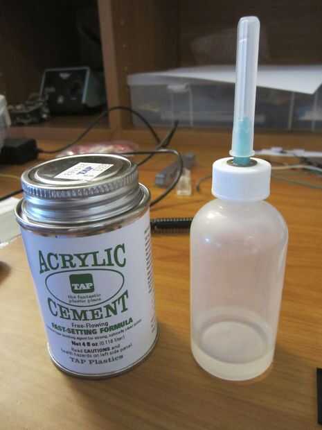 Una vez que te sientes bien acerca de su configuración, empezar a pegar las piezas! Un truco aseado para usar la aguja hipo para aplicar el cemento es exprimir la botella mientras que es vertical, luego gírelo boca abajo para aplicar el cemento. Esto permite mantener una especie de presión negativa en el interior (soltando el exprimir un poco) hasta que esté listo para aplicar, asegurando de este modo usted no termina con cemento acrílico en lugares te no deseo.