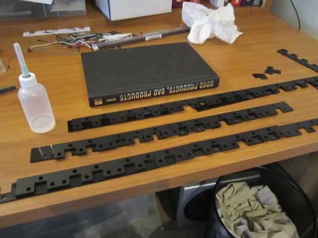 Asegúrese de que tiene una gran superficie plana de trabajo y también algunas piezas extras de acrílico para elevar las piezas que usted está pegando fuera de la mesa un poco - y asegúrese de que están la misma altura de la mesa, obviamente. Afortunadamente para mí, tuve algunas piezas adicionales que habían sido cortados incorrectamente o agrietados...