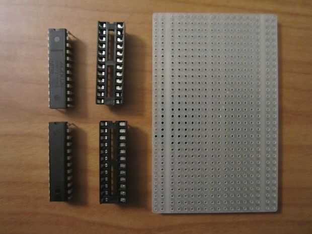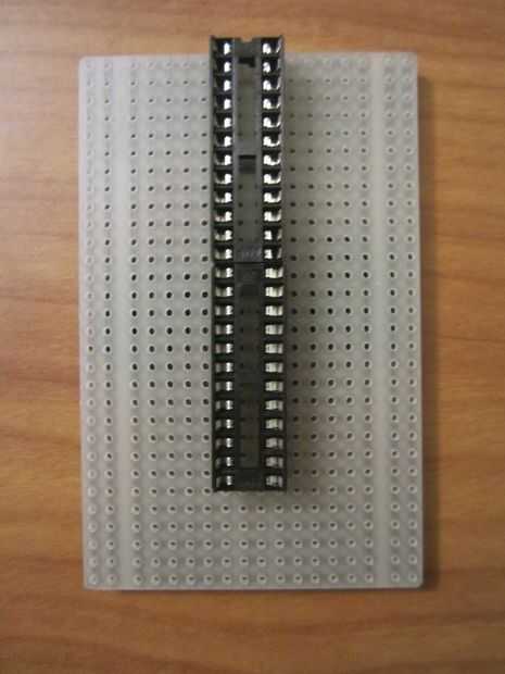 Paso 1 - las fichas. Ya que cada chip puede controlar 64 LED, necesita dos. Y porque virutas pueden se lastime por el calor de soldadura, debe tener un zócalo de 24 pines para cada uno también. Mezcle en la Junta, soldarlos y luego insertar las fichas. Puede dejar una fila o dos entre las tomas, pero ten en cuenta que necesita tres filas por el potenciómetro en un extremo. Recuerda que el "top" de los chips (y tomas) tiene ranuras semicirculares y el pin 1 es justo a la izquierda y están numerados aumento CCW desde allí.