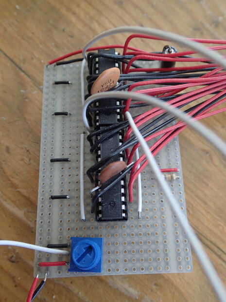 Paso 5 - cables de Control (blanco). Conectar el pin 12 en el chip 1 al pin 12 en el chip 2, luego soldar un alambre largo que finalmente irá al pin 3 de salida del Arduino. Lo mismo con perno 13 en cada chip - esto eventualmente se conectará al pin 4 en el Arduino. Por último, conectar 24 en chip 1 al pin 1 en el chip 2 - este es el cable de comunicación entre los chips.