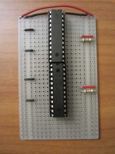Paso 3 - condensadores. Conecte un capacitor de 10mF entre alimentación y tierra en un lado y dos capacitores de 100nF en los chips, también entre alimentación y masa.