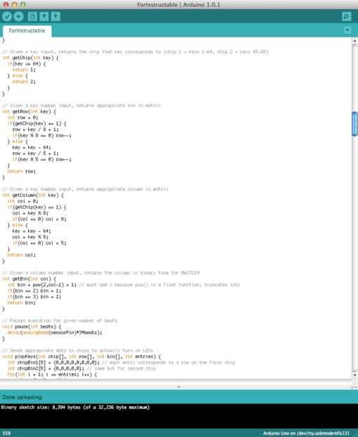 Tomé prestado el código y las declaraciones de registro que se relacionan directamente con el MAX7219 chips escribieron el resto (vea la atribución en el archivo de código). Lo que el código MAX7219 es acuerdos con las fichas directamente, para que cualquier función que escribió más tarde podría fácilmente decirles lo que deben hacer los LEDs en un lenguaje sencillo.