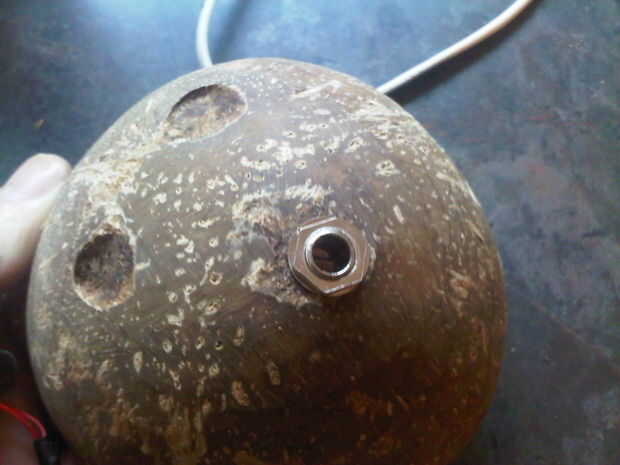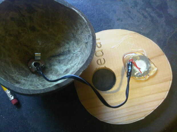 En este paso usted tendrá a mano la mitad de una cáscara del coco que ya han lijado plano a través de la abertura y enarenada apagado todos los bits fibrosos en el exterior. Usted también habrá cosechado un elemento piezoeléctrico de una alarma de ventana del almacén del dólar, así como 1/4 de pulgada jack estéreo o mono. Usted también necesitará unos 6 u 8 pulgadas de alambre del altavoz (o el cable de alimentación de un viejo adaptador de CA). Algo de madera para la parte superior y algunos caliente derretimiento pegamento.