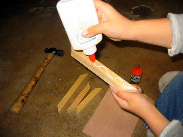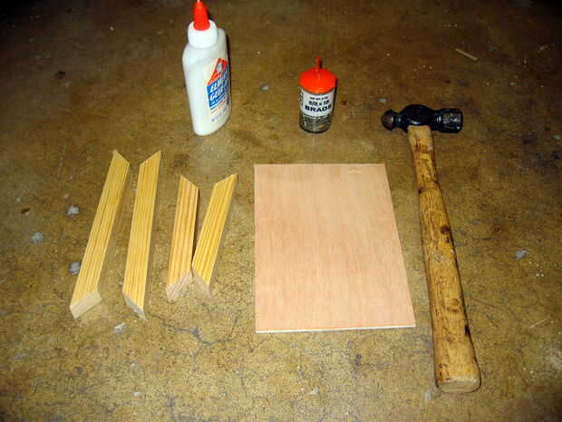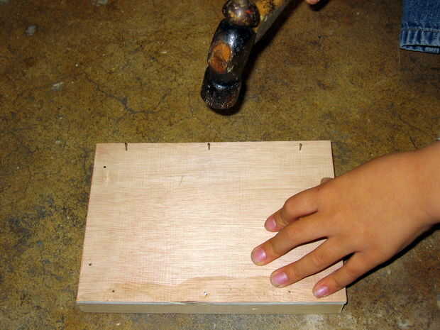Cortar dos hojas de 5 "x 7" de madera contrachapada para la parte superior e inferior de la caja y el pino de 3/4" en tiras de 4 a 45 para los lados - 2 a 5" y 2 a 7". Pegamento (opcionalmente) clavar los lados en la parte inferior con clavitos pequeños, y póngala a un lado. Importaba usar clavos para unir la parte inferior mientras se secaba. No muestran mucho pero sólo podría sujetar en su lugar. Sólo asegúrese de puso en profundidad suficiente para que no sobresalga y raspar cosas.