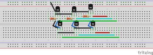 Por lo tanto para 2m, necesitamos seis transistores (3 para cada tira - rojo, verde y azul LED). Ver el diagrama anterior de Fritzing y mi circuito para hacer el circuito de transistor en un protoboard.