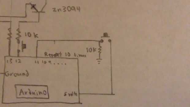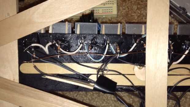 Para cablear el teclado, utilice el diagrama del circuito anterior. Cada botón debe tener un perno va a 5 voltios y un perno va a uno de los pines digitales del Arduino. Cada uno de los pines digitales del Arduino deba ser derribado a tierra por un resistor del 10 k para evitar lecturas falsas debido a la radiación electromagnética de fondo. cable de cinta puede utilizarse para conectar el teclado al Arduino.