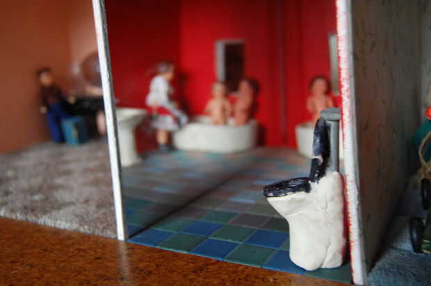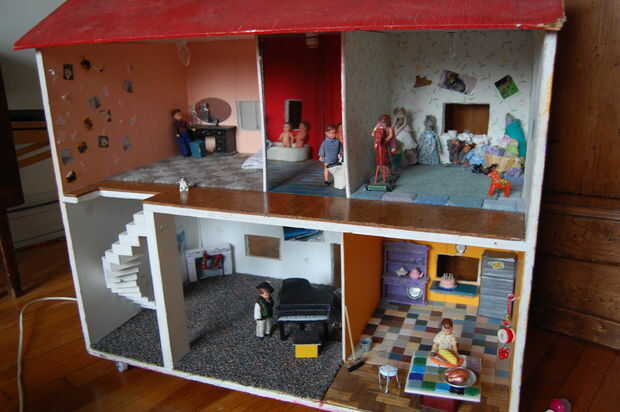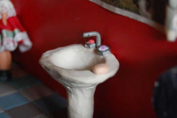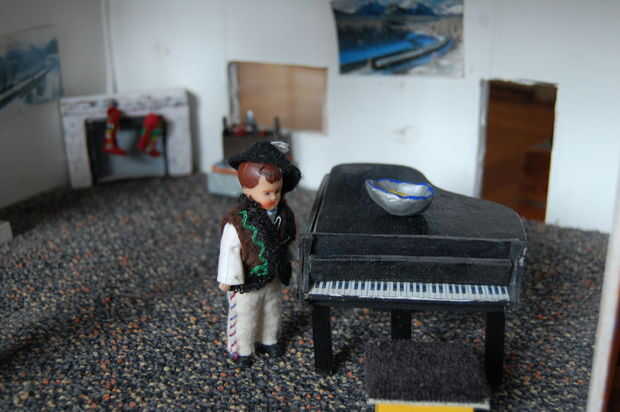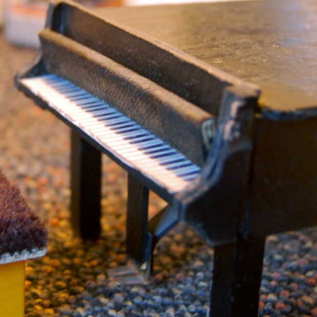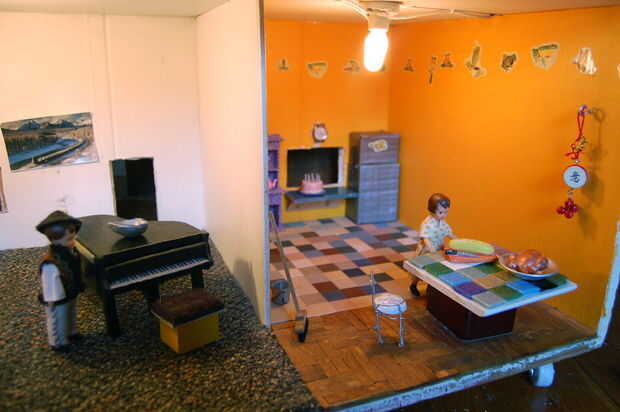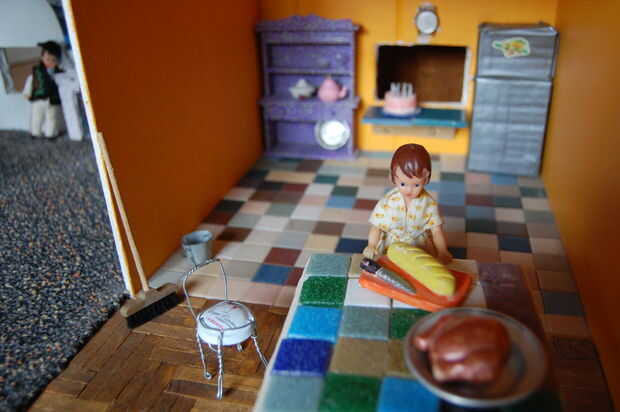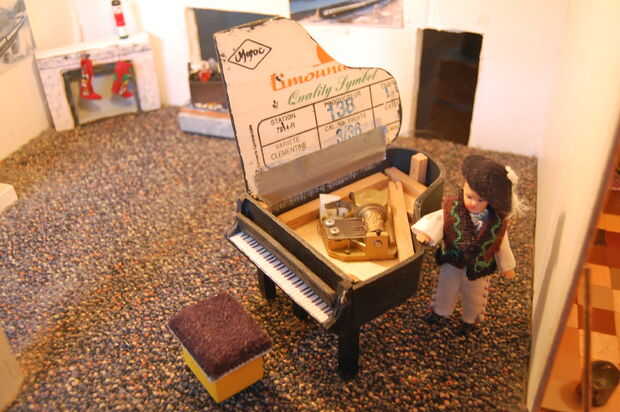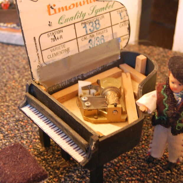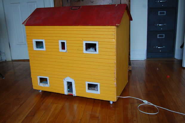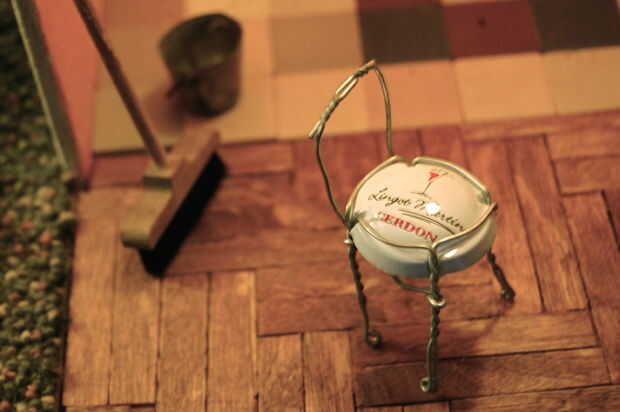 Sólo por diversión he añadido fotos de algunos de los otros muebles casa de muñecas, también fabricados con materiales de reciclado sobre todo. Azulejos y alfombras fueron desechadas muestras arquitectónicas, suelos de parquet se hizo de paletas tiraron palos de arte de mi niño (continuación) (con su total aprobación: me informó había utilizado intencionalmente una cantidad excesiva por lo que se podría reciclar las piezas...). La silla se hizo con los cables y la tapa de una botella de champagne. La concha de la casa en sí era lo Inicio en un día lluvioso de la basura, y fue pintado con restos encontrados en el sótano de mi edificio de apartamento.