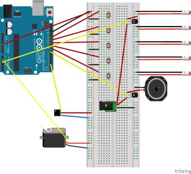Este esquema muestra el cableado adecuado para el piano de láser. Puesto que Fritzing no incluye un componente de sensor táctil capacitiva, el esquema utiliza un marcador simulado. Este lugar es el componente justo encima del motor cinemático. El sostenedor del lugar ficticio está conectado exactamente cómo un sensor táctil capacitiva conectarse a este circuito. Otra cosa a notar es que Fritzing no incluye una fuente de alimentación de 5V 500mA. Para acomodar esto, usé DC fuente de alimentación. Esta fuente de alimentación se encuentra justo a la derecha del titular lugar ficticio. Una vez más, esta fuente de alimentación está conectada exactamente como cualquier fuente de alimentación de 5V 500mA debe cablearse a este circuito.