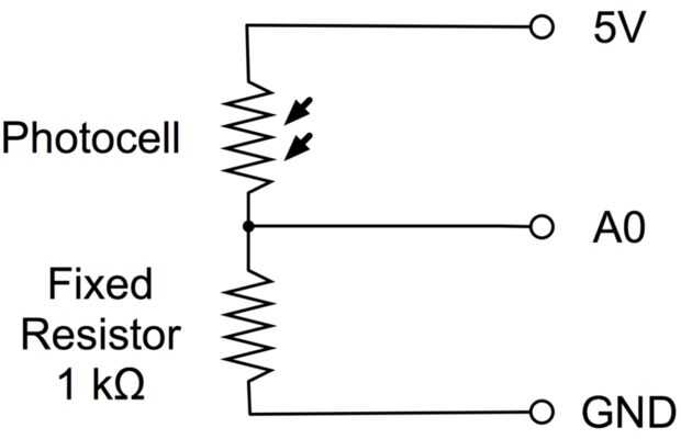 Te sugiero que primero obtiene su circuito de sensor de luz básico establecido, usando un protoboard y un Arduino, por lo que usted entiende cómo la detección de luz básica funciona. La imagen de este paso es el diagrama básico que necesitará. Vienen una vez que usted puede leer un fotoresistor con tu Arduino!
