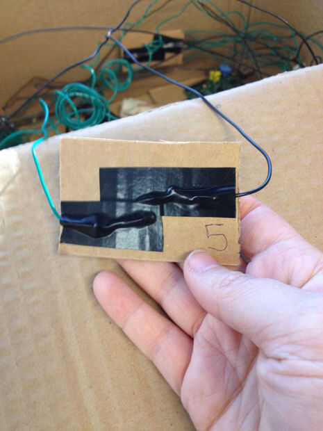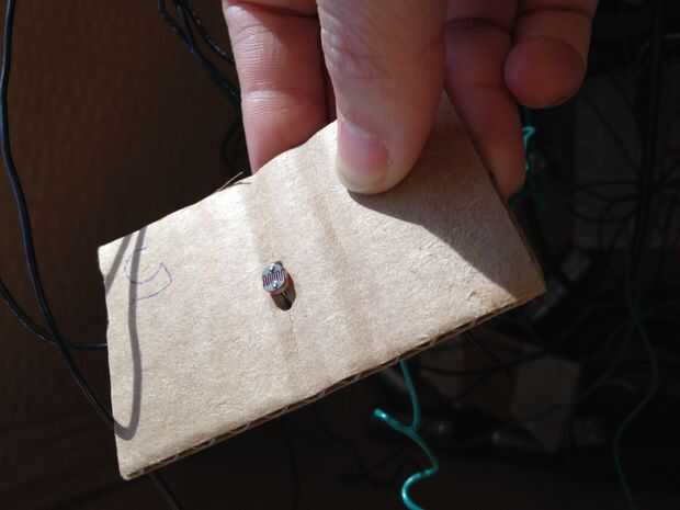 Me pareció útil usar forro de cartulina para mantener estable los fotorresistores. Las patas del sensor a través del palillo y con cinta adhesiva en su lugar con cinta aislante.