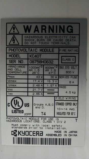 - un panel solar de 40-50W - estoy usando un más viejo 40W panel monocristalino de Kyocera, pero cualquier 40 o 50W panel sería suficiente, y hay mucho por ahí que son mucho más baratos. Puede utilizar un panel más grande si quieres, sólo asegúrese de que su salida máxima está dentro de la gama que se puede disfrutar de su controlador de carga. Por ejemplo, el voltaje máximo (Voc) de mi panel solar es 21.7V, es de máxima corriente (Isc) 2. 65A (ver la etiqueta en la parte posterior del panel para estas especificaciones), y mi controlador de carga puede tomar un máximo de 30V, 6.5A, así que estoy bien dentro de los límites.