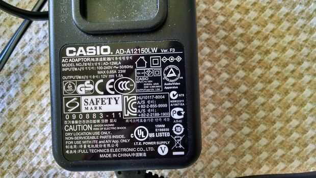 - un teclado de piano digital que toma una entrada de 12VDC - Compruebe la parte posterior del adaptador que se enchufa en el teclado - debe tener dos líneas que indican la tensión de entrada y corriente, entonces el voltaje de salida y corriente. Ver foto de arriba del adaptador para mi piano: el voltaje de entrada es de 12V y la corriente de entrada es de 1.5A. Mi teclado es un Casio CDP-120.