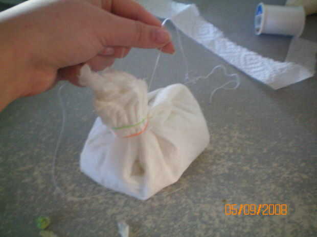 Atar un trozo pequeño de thred alrededor de las toallas de papel. Asegúrese de que está muy apretado y no se salga.