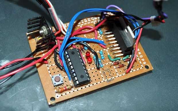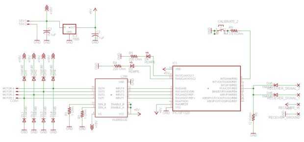 Unidos son algunos esquemas de los componentes de este circuito para ayudar a explicar cómo funciona. Sólo hay 3 elementos principales. El regulador, el L298n doble puente H conductor del motor y por supuesto el 18F1320 PIC. Hay además un botón, 2 leds y un puñado de resistencias y diodos de protección.