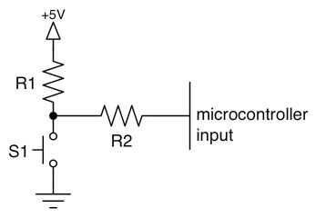 A continuación es un simple diagrama de los cables del botón. La resistencia a + 5v es un tirón para arriba del resistor. Es alta resistencia y sin él cuando no empuja el botón del perno se conectaría a nada, así que no habría ninguna garantía sería baja o alta, esta resistencia sólo "tira de él para arriba" cuando no se pulsa el botón conectar a 0v.