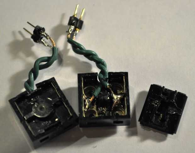 Tenía algunos viejos cables de Lego que venían aparte. Si está utilizando un cable de Lego ruina que encontrará que si usted Levante suavemente el borde enfrente el alambre hacia atrás y hacia arriba con un destornillador pequeño saltará. En el interior encontrarás que se sueldan los cables Lego sobre dos placas de cobre que hacen contacto en la parte superior e inferior.