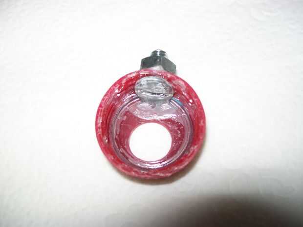 1 Perfore un orificio de 1/2" en la parte inferior de la tapa 2 Perfore un orificio de 1/4" en el lado de la tapa 3 Coloque un poco de pegamento alrededor del orificio de 1/4" 4. Enrosque el perno en el agujero de 1/4" y tornillo en la tuerca 5. deje sentarse hasta que el pegamento ha fijado.