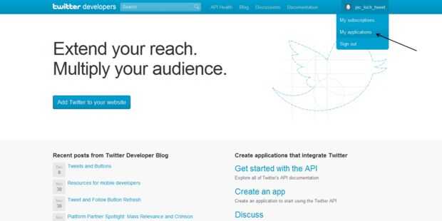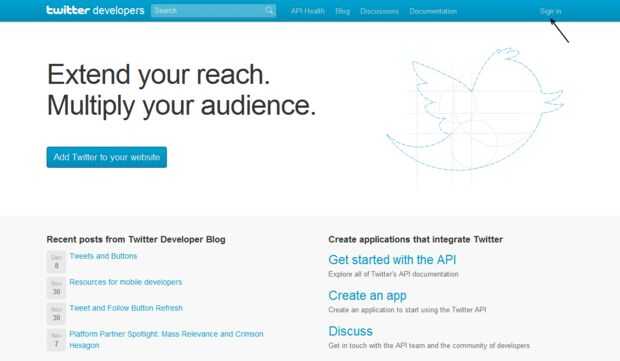 1. Si ya tienes una cuenta de twitter salta a la página de desarrolladores de twitter en https://dev.twitter.com/ si no tienes una cuenta en twitter crear uno y saltar a la página de los desarrolladores.