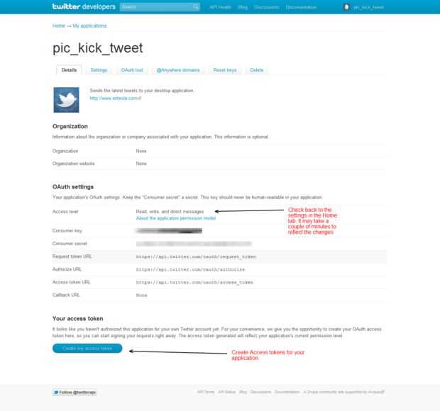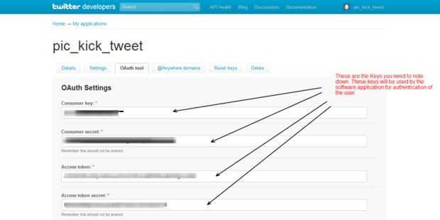 8. Puede tomar un momento para generar los tokens de acceso. Una vez creado, ir la pestaña de herramienta OAUTH para encontrar las claves que necesita para la autenticación de la aplicación que usted la hará los siguientes pasos. Copie estas teclas en el Bloc de notas. No compartir estas claves con los demás.