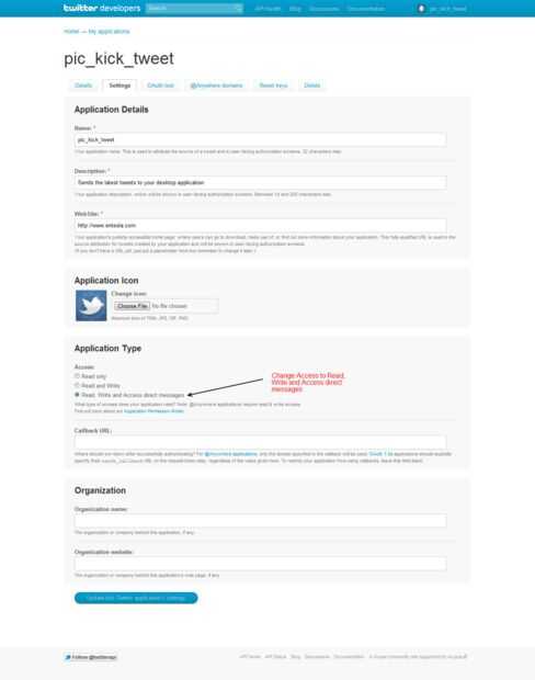5. Ir la ficha configuración . En Tipo de aplicación Seleccione tipo de acceso para leer, escribir y acceder a mensajes directos. Espere un par de minutos y compruebe si el cambio se ha reflejado en la ficha detalles .