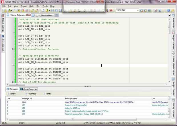 Abra el MikroC. Cree un nuevo proyecto y seleccione P16F877A microcontrolador con frecuencia 8 Mhz. nombre del proyecto 'Regulador de volumen' para incluir todos los archivos de biblioteca. Si no desea incluir los archivos de la biblioteca, entonces incluya < lcd.h > y < lcdconstants.h > en el programa. Solo copiar y pegar el código en Mikro C
