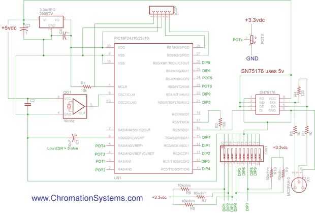 Asegúrese de que el potenciómetro tiene su voltaje enganchado justo por el sentido correcto es el valor hacia arriba o hacia abajo. En mi caso contactos de la olla en la parte inferior de la junta fue enganchado a fin negativo y otro positivo, por lo que cuando las ollas se resbalaron hacia arriba hacia el PIC, aumentó el valor DMX. Hice mal en primer lugar y tuvo que volver atrás y arreglar. Centro de la olla debe conectarse el pin PIC, el otro a 3, 3V (no 5v) y de la tierra.