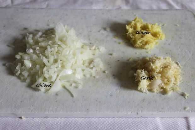 Chopp las cebollas en pedazos pequeños. Gran el ajo y el jengibre también.