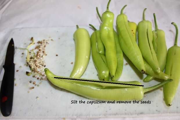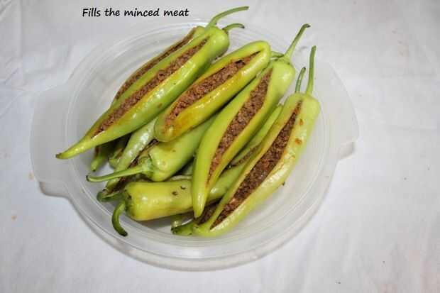 Lavar el pimiento verde y la raja en el medio de arriba a abajo en un lado. Con los dedos quitar las semillas lejos y rellenar los pimientos con la carne picada cocida. Puede rellenar lo completo o lo suficiente como se rellena el pimiento entero.