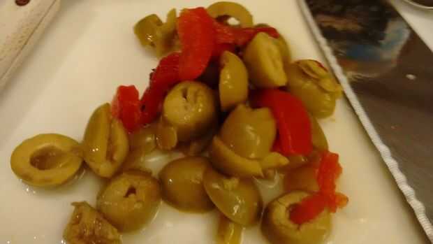 Cortar un montón de aceitunas - 2-3 cucharadas menos. Creemos que no puede tener demasiadas aceitunas en este plato.