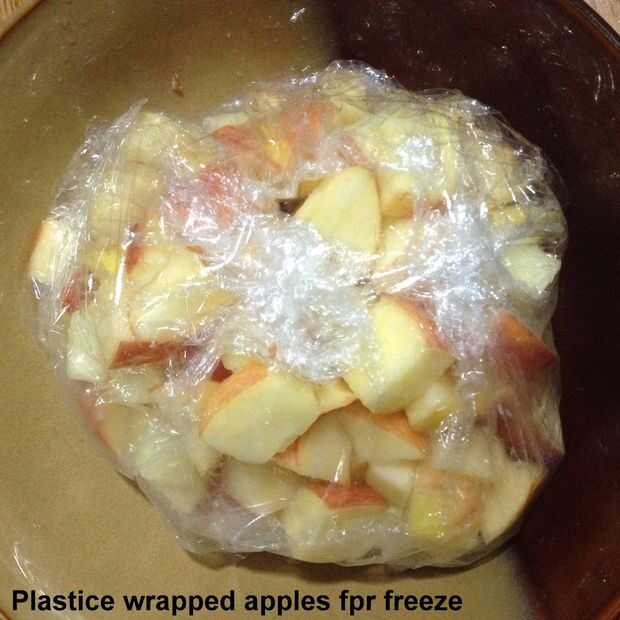 Cortar las manzanas en cubos y mezclar en jugo de limón 1 cucharada envolver con el plástico de envolver y congelar por una hora