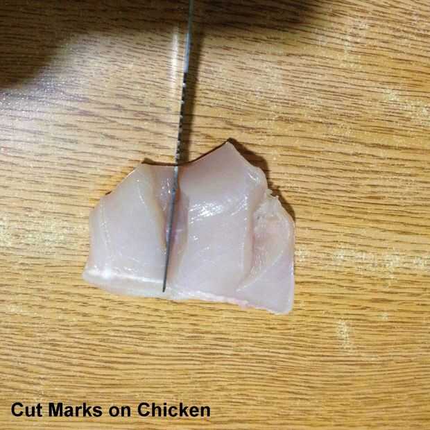 Hacer cortes en el pollo con un cuchillo filoso para pollo sea jugosa después de parrilla y el marinado que cosas dentro el pollo.