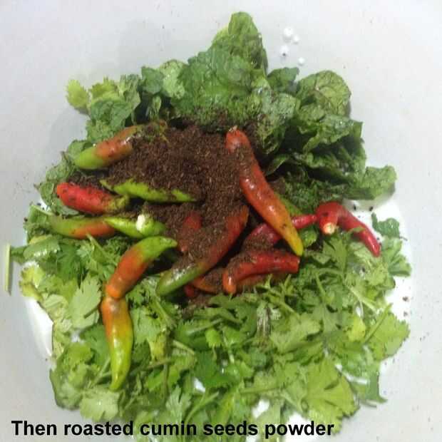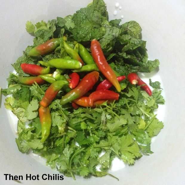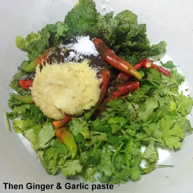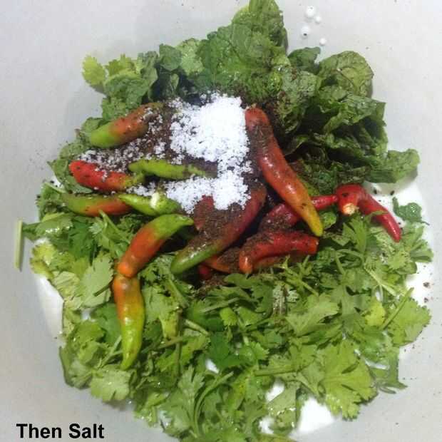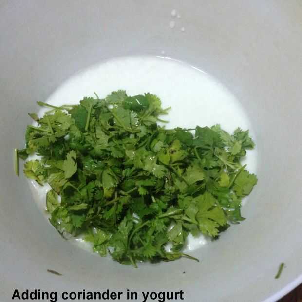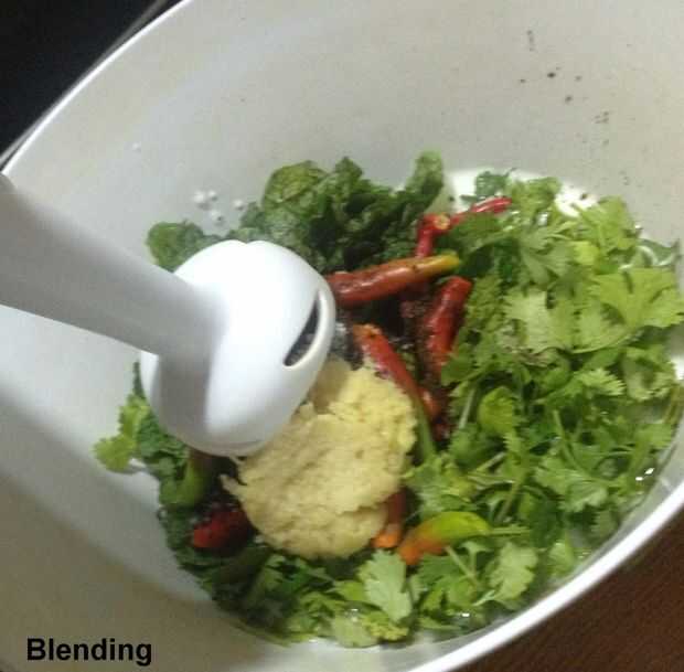 En la licuadora de mano o jarra mezcla mezcla yogur, cilantro, hojas de menta, chiles verdes, semillas de comino tostado, sal y jengibre y el ajo hasta obtener una pasta suave (no te preocupes las semillas del Chile que no mezclan).