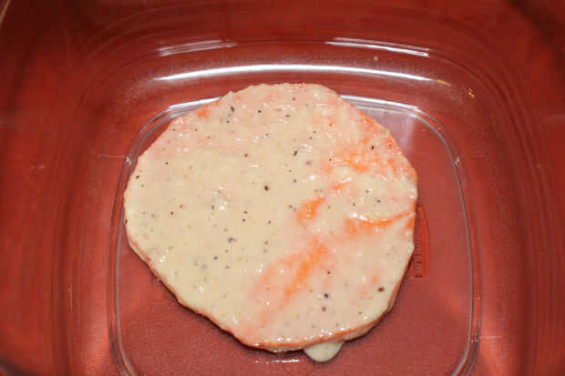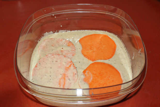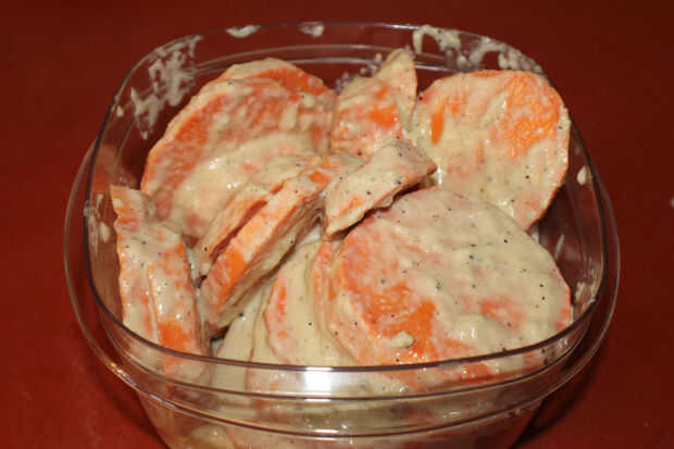 4. Poner las batatas en la marinada bien les cubra, luego poner en otro recipiente, dejando una capa de salsa sobre cada trozo.