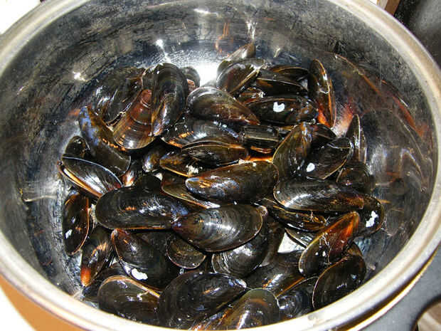 Tapar la olla y cocinar mejillones a fuego alto por 5-7 minutos, hasta que las cáscaras están abiertas